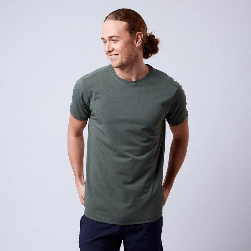 Bambu t-shirt herr Modern passform 46% Bambu, 49% Bomull, 5% Elastan Maskintvätt Modellen har storlek M, är 181cm och väger 75kg