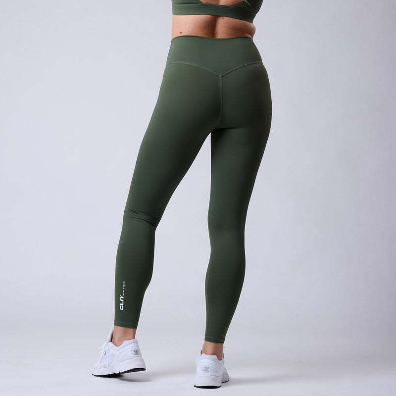 Gröna träningstights dam Tight passform Hög midja Full längd har 6cm längre innerbens längd än 7/8 70% Återvunnen polyamid, 30% Elastan Maskintvätt Modellen har storlek S och är 175cm lång