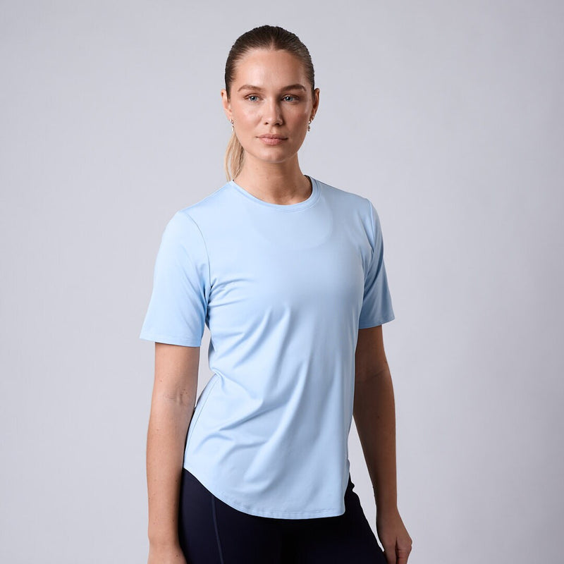 Ljusblå t-shirt med längre arm Funktionsmaterial Hög fukttransport förmåga Ledig passform 88% Återvunnen polyester, 12% Elastan Maskintvätt Modellen har storlek S och är 175cm lång