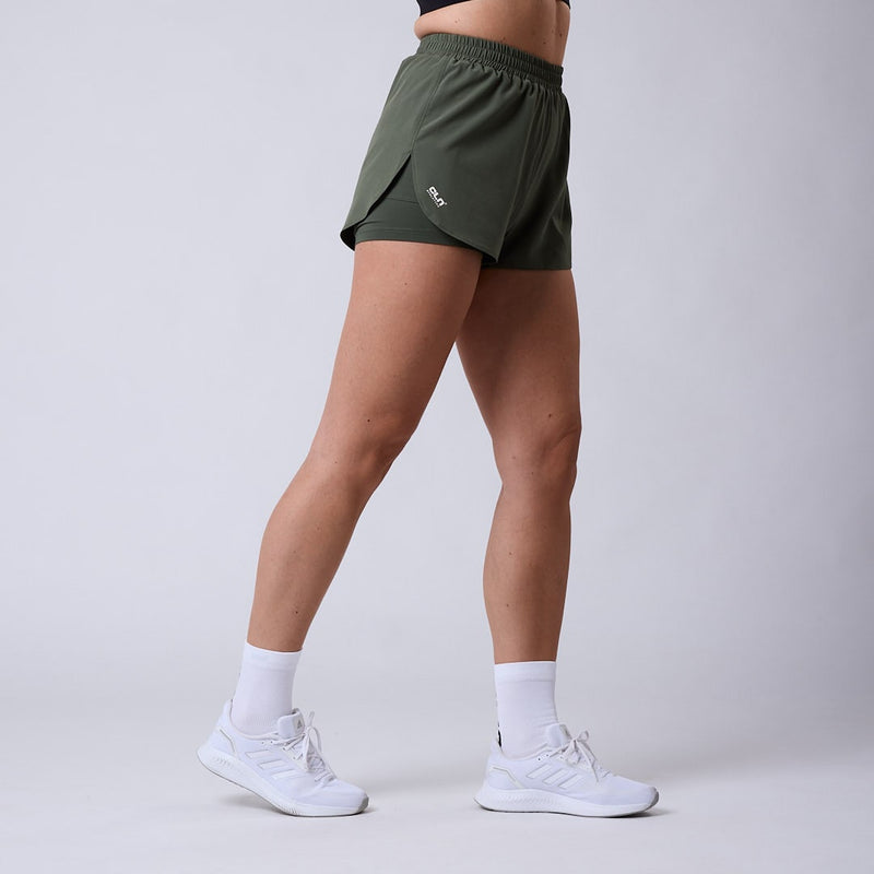 Gröna träningsshorts för dam 2-in-1 shorts Elastisk midja med justerbar dragsko Smart mobilficka på innertights Normal passform 88% Återvunnen polyester, 12% Elastan Maskintvätt Modellen har storlek S och är 175cm lång.