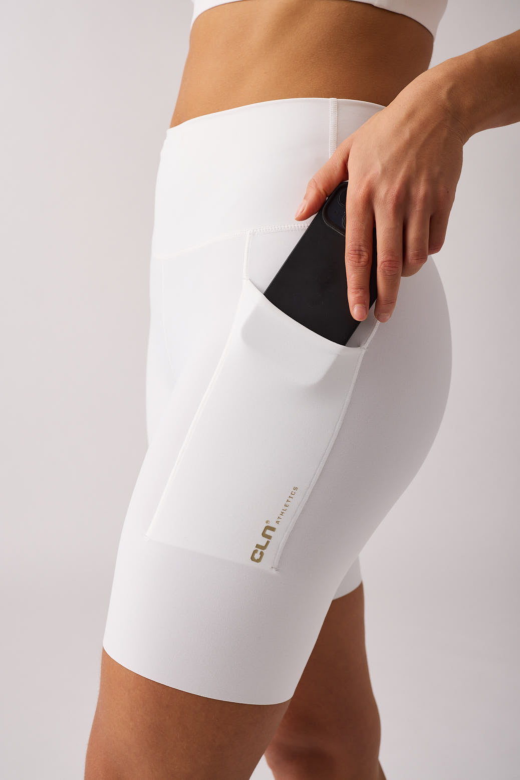 Med två praktiska fickor på låren har du plats för mobil, nycklar eller kort. Perfekt när du vill träna eller röra dig fritt utan extra tillbehör. Den stilrena CLN-loggan på benet ger ett clean och sportigt uttryck.